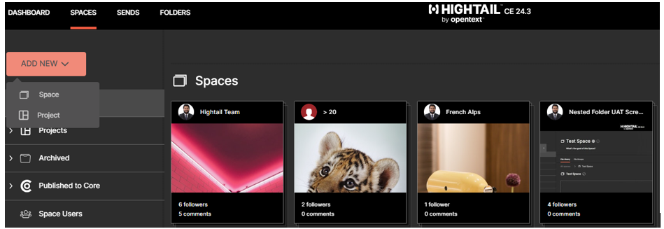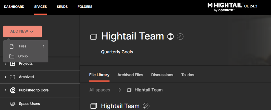 The "Add New" button is your one-stop solution for creating new items in Hightail. Depending on your current location within the app, it intelligently adapts to let you add the right type of content—be it a new space, project, file, or group.